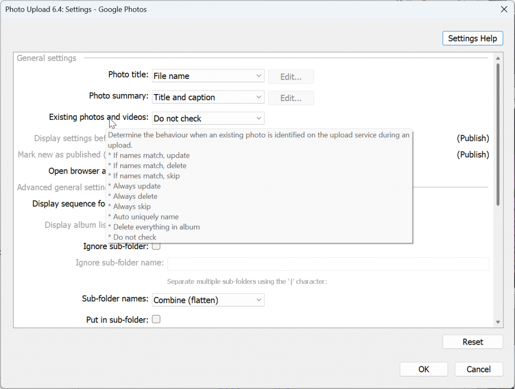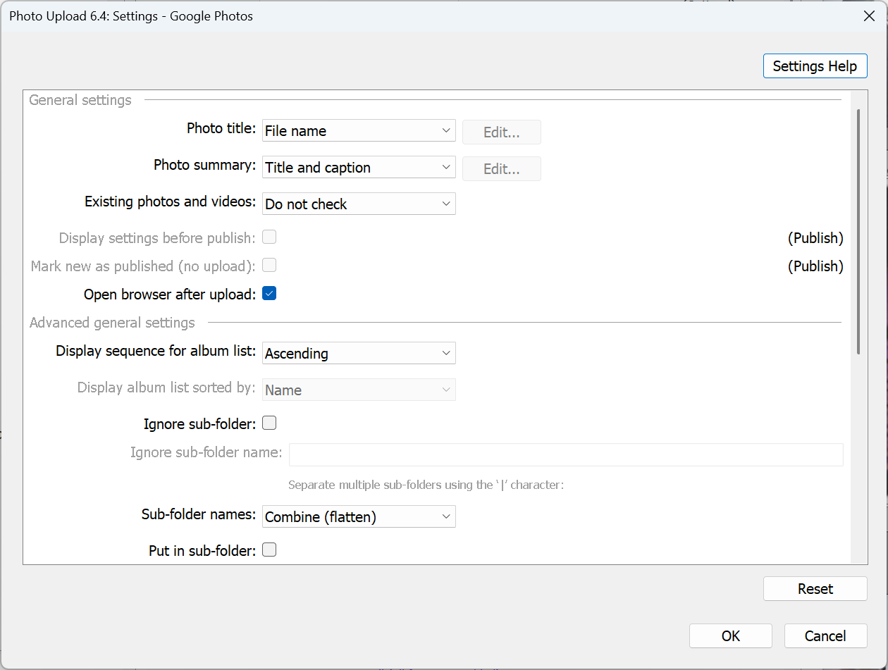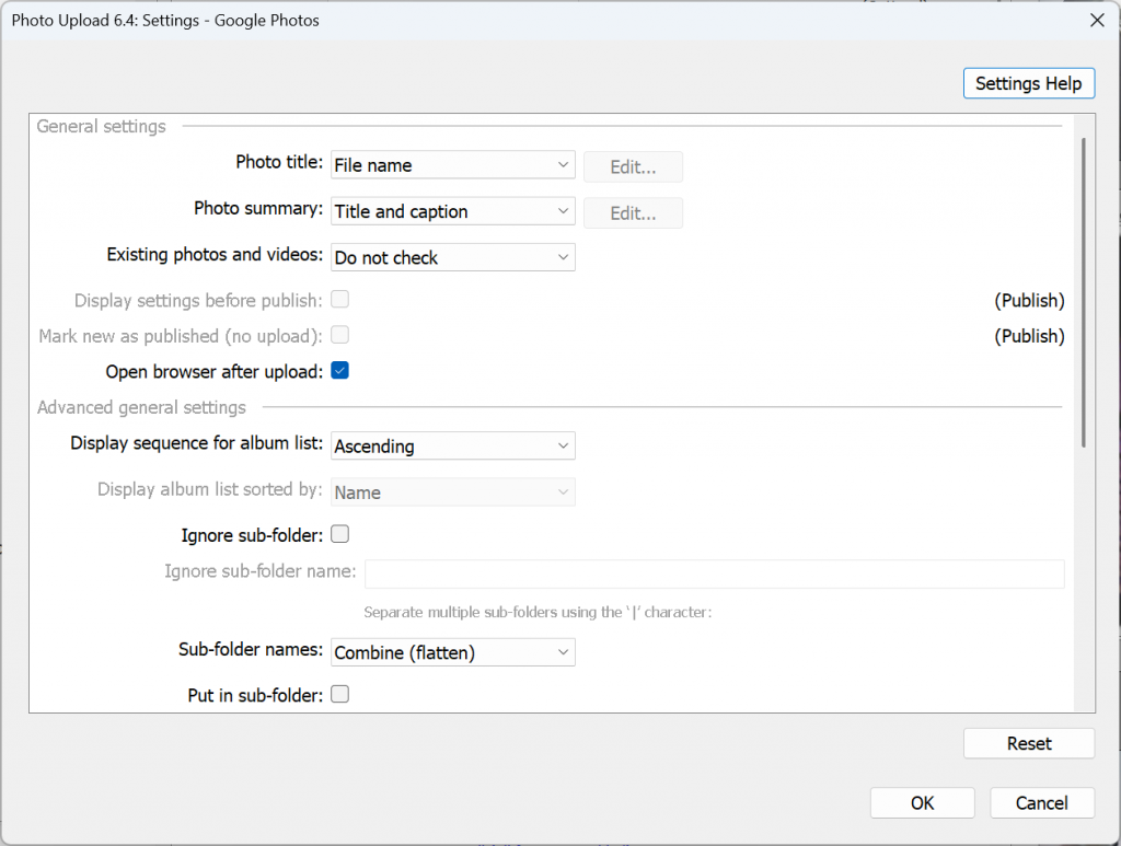 When creating or editing an album or folder within a publish service the following settings may be available depending on the upload service selected.