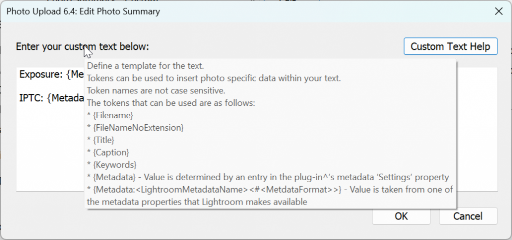 Some settings, such as “Photo title” and “Photo summary” allow you to use the Custom Text window to define a template for the text.