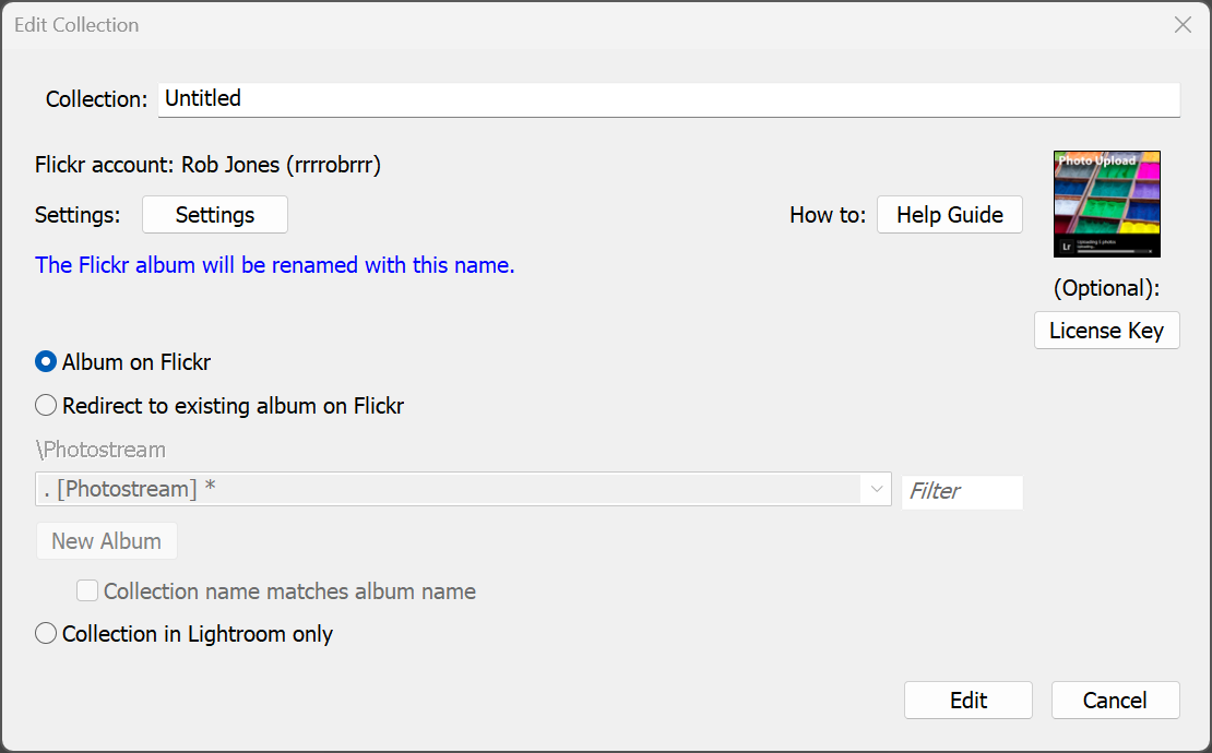 Specifies that this collection/collection set is redirected (i.e. linked) to an album/folder on the upload service. Any photos published from a collection with this setting will be uploaded to the redirected album on the upload service. You can name the collection in Lightroom differently to the album on your upload service.